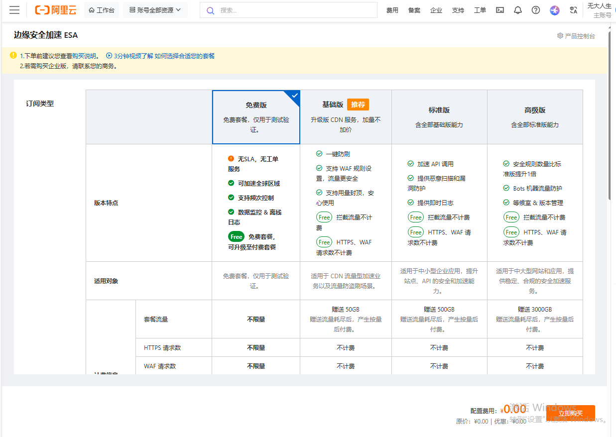 1.这个免费套餐一个账号只能购买一个。